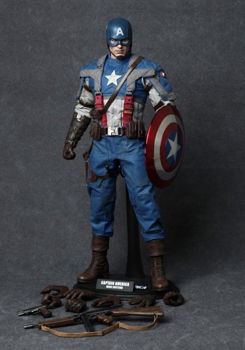 Are you ready for the Captain America The First Avenger 1/6 Scale Figure by Hot Toys. We are pleased to offer you this incredible Hot Toys MMS figure, featuring the likeness of actor Chris Evans as Captain America and with over 30 points of articulation.The greatest hero of the Marvel Universe, Captain America, hit the big screen in 2011 taking on the Red Skull and his Nazi thugs. This fullylicensed Captain America 1/6 Scale Figure stands approximately 12 inches tall and includesBody Helmeted head Muscular body with over 30 points of articulations Movieaccurate facial expression with detailed wrinkles and skin texture Nine (9) pieces of interchangeable gloved palms including One (1) pair of palms for holding shield One (1) pair of palms for wielding shield One (1) right palm for holding gun One (1) pair of relaxed palms One (1) pair of fists Each piece of head sculpt is specially handpaintedCostume One (1) blue and grayishwhite jacket with embossed pattern as well as stars in chest and arms One (1) pair of grey and red suspenders One (1) pair of blue pants One (1) brown leatherlike belt with pouches and pistol sheath One (1) pair of brown bootsWeapons One (1) metallike electroplated shield One (1) machine gun One (1) pistolHot Toys figures are one of the most sought after 1/6 scale manufacturers today.